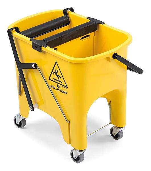 Seau bi-bac avec cloison de séparation et roues. Système de presse à rouleaux intégré avec un rouleau en plastique et un rouleau en caoutchouc plus résistant, garantissant un essorage supérieur, commande au pied. permet d’essorer tous types de franges et plus particulièrement les franges microfibre. Idéal pour les marches d’escalier.