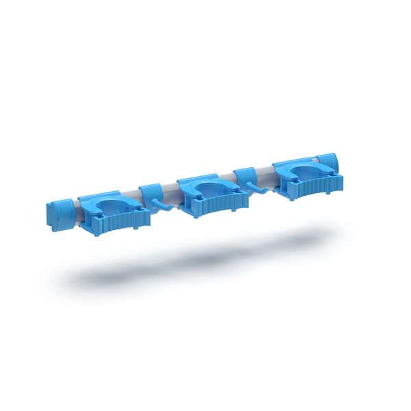Barre de mur d’outils en aluminium fourni avec support à fixer au mur, 3 supports pour les poignées Ø 25-35 mm, 2 crochets, kit de montage. Disponible en bleu, rouge, jaune, vert et blanc.