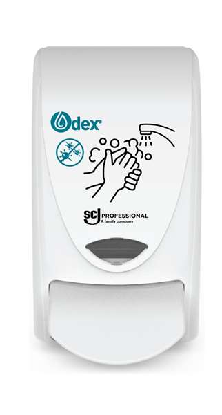 Distributeur à bouton poussoir large et facile à actionner en ABS Pompe blanche spéciale mousse intégrée à la cartouche ODEX à usage unique Hygiène garantie et juste dose délivrée à chaque pression Format adapté à tous les lieux même les plus exigus